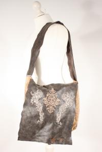 A stunning, huge handbag made from a lovely jaquard-fabric, the flap made from a unique, vintage-style leather, decorated with aa awesome embroidery of stilized angelswings.