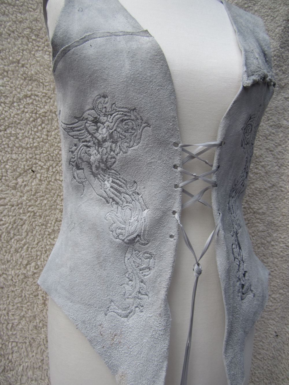 Corset- style corsage tied with laces, nicely fitted and decortaed lushly with embroidery.