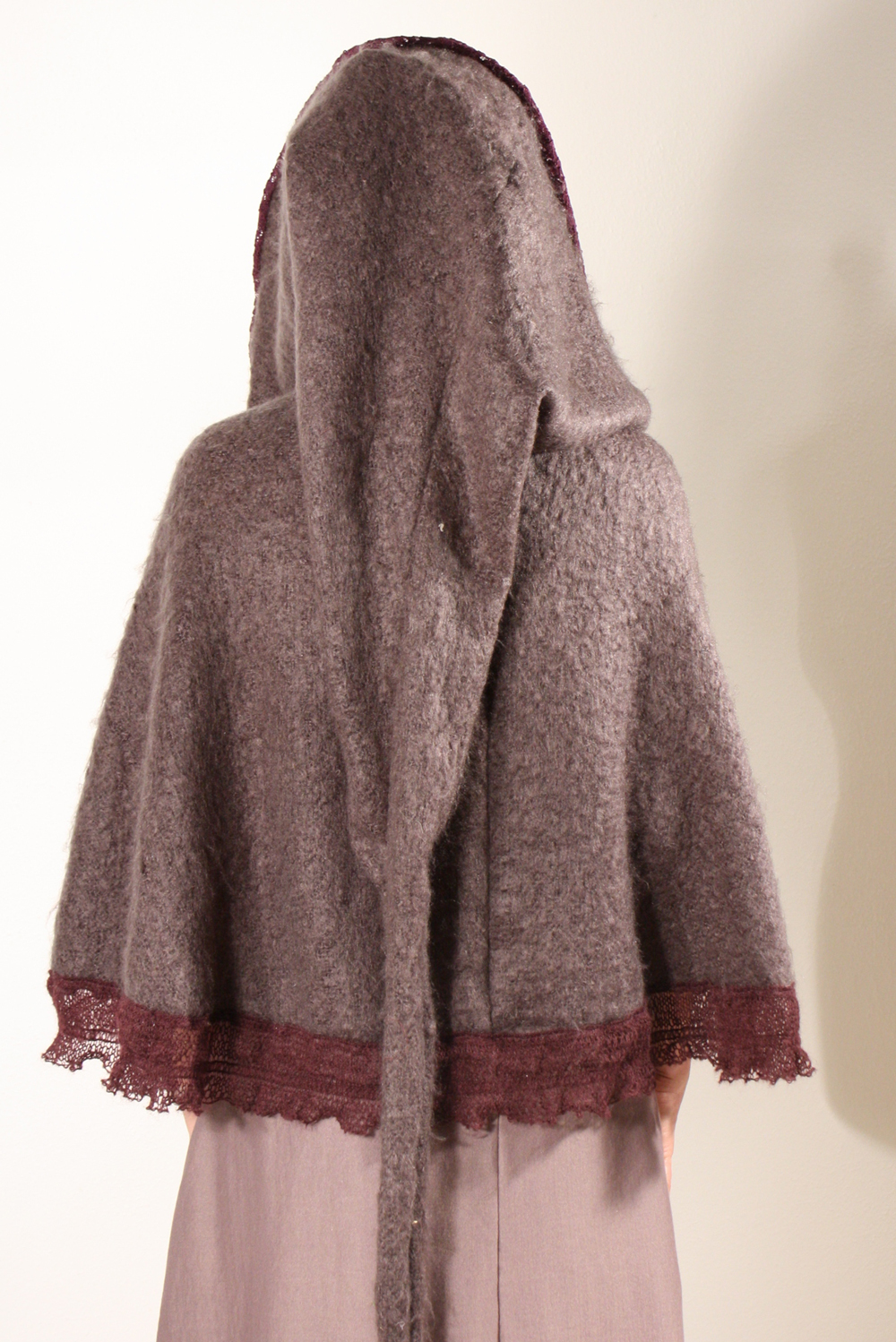 A multifunktional shawl with my trademark jellybag-hoodie. You can wear it open, just like a stola, you can tie it in front of you, so that it wont slip down your shoulders, but the best thing is, cause the shawl is so very long, you can cross it in front of you, and than tie it in your back, underneath the hoodie and keep warm and snuggly, even if an evening might get cold... the perfect spring-summer-autumn accessorie you will never want to miss again!