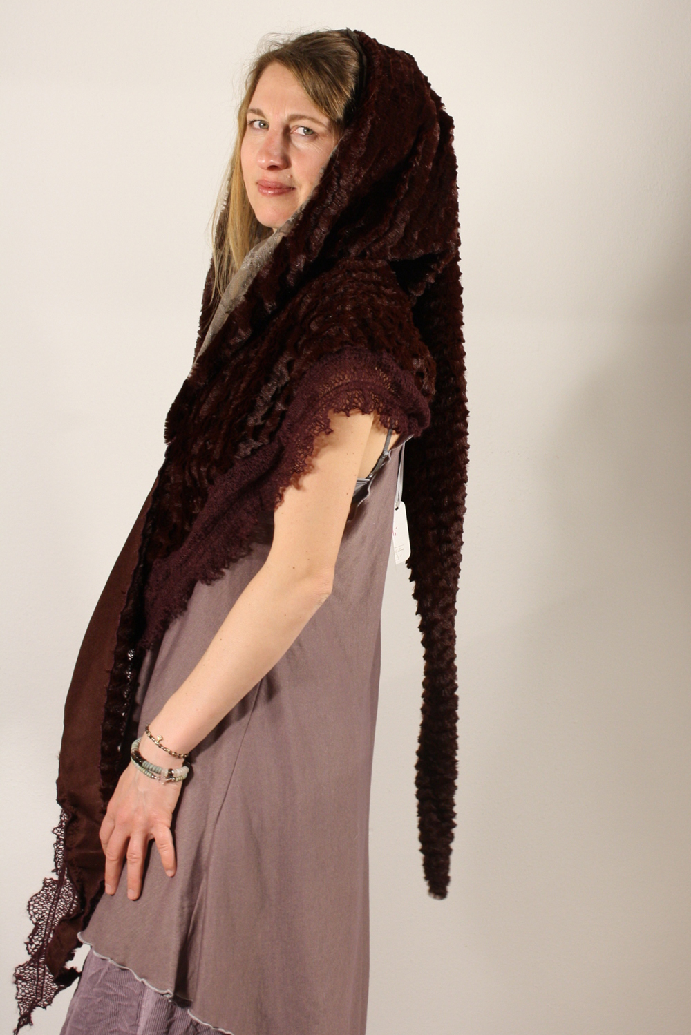 A multifunktional shawl with my trademark jellybag-hoodie. You can wear it open, just like a stola, you can tie it in front of you, so that it wont slip down your shoulders, but the best thing is, cause the shawl is so very long, you can cross it in front of you, and than tie it in your back, underneath the hoodie and keep warm and snuggly, even if an evening might get cold... the perfect spring-summer-autumn accessorie you will never want to miss again!