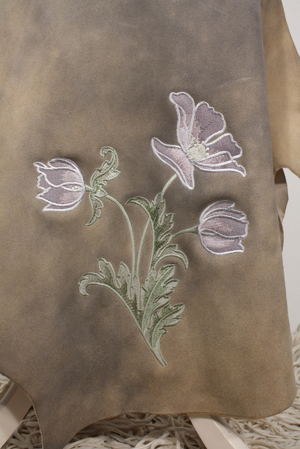 Very long suede skirt, made from a rather strong material, lovely embroidery of a poppyflower on the back.